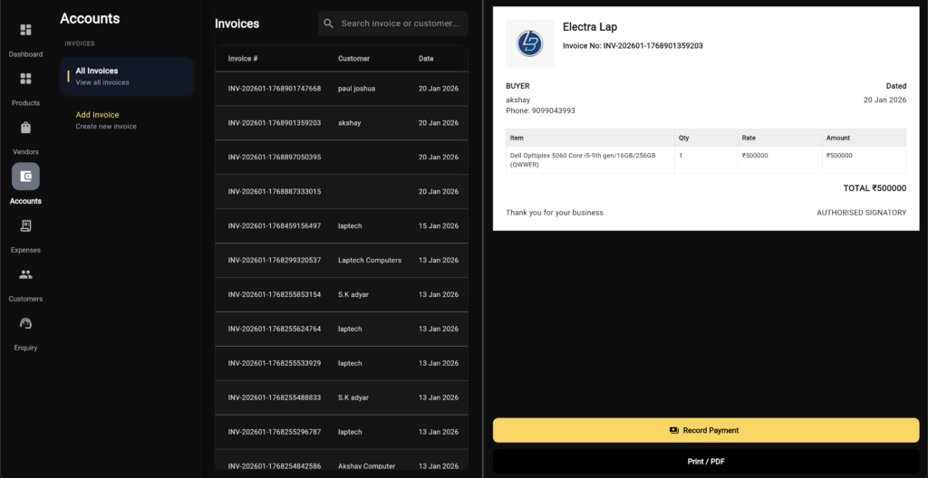 Generate invoices, track transactions, and keep complete sales history in one place.